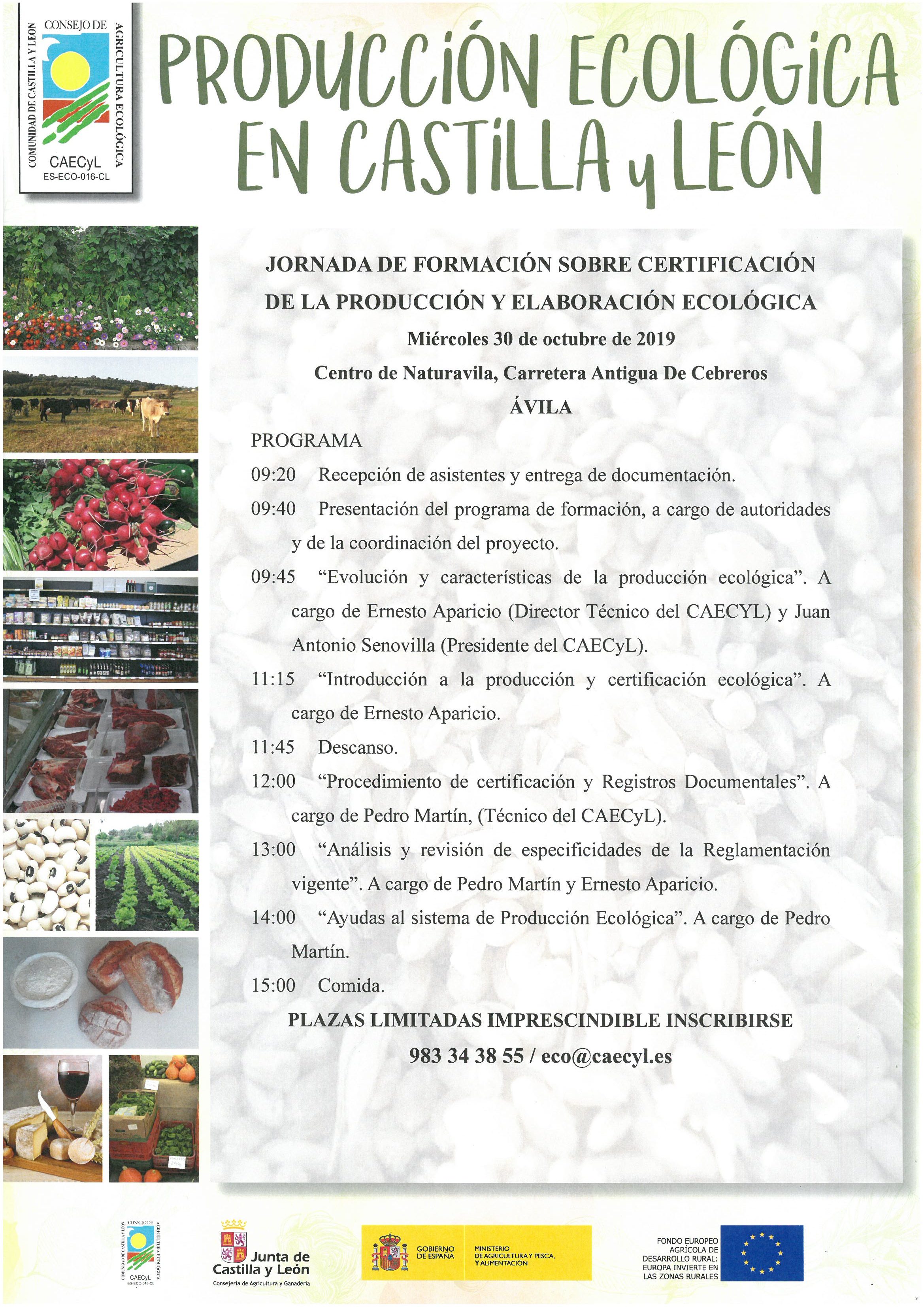 JORNADA DE FORMACIÓN SOBRE CERTIFICACIÓN DE LA PRODUCCIÓN Y ELABORACIÓN ECOLÓGICA, miércoles 30 de octubre de 2019, en Ávila